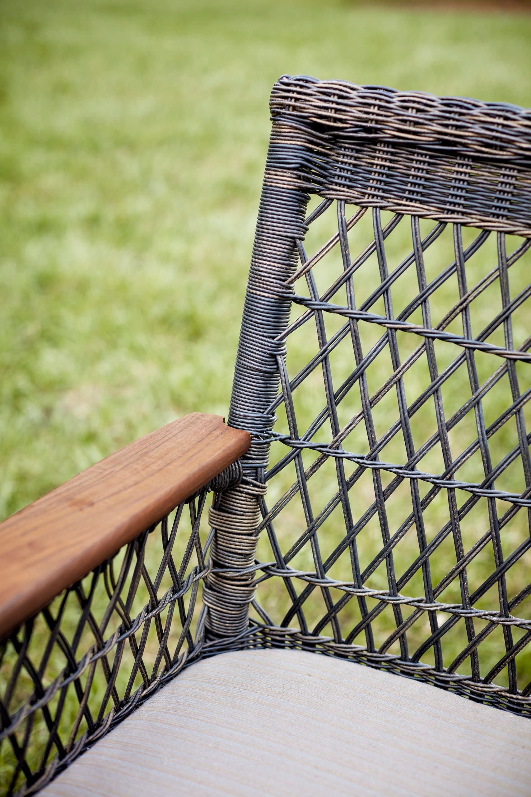 Vintage features a charismatic blend of the finest materials with a deep brown and bronze Viro® Fiber weave coupled with a light, yet sturdy, powder-coated aluminum frame. These materials bring out this antique-inspired collection in a fresh, new light. The open weave provides the dark fibers with an airy affectation, while smooth-as-glass Ipe arm tops offer tactile relaxation. Artistic accents of FSC-certified Ipe timber add a refined richness to table tops, chair arms and supportive feet of the frames. Ipe displays a stunning, chocolate brown shade when new that can be allowed to gracefully evolve into a subtle silver patina over time that complements the collection’s vintage styling or kept ‘as new’ with minimal care.