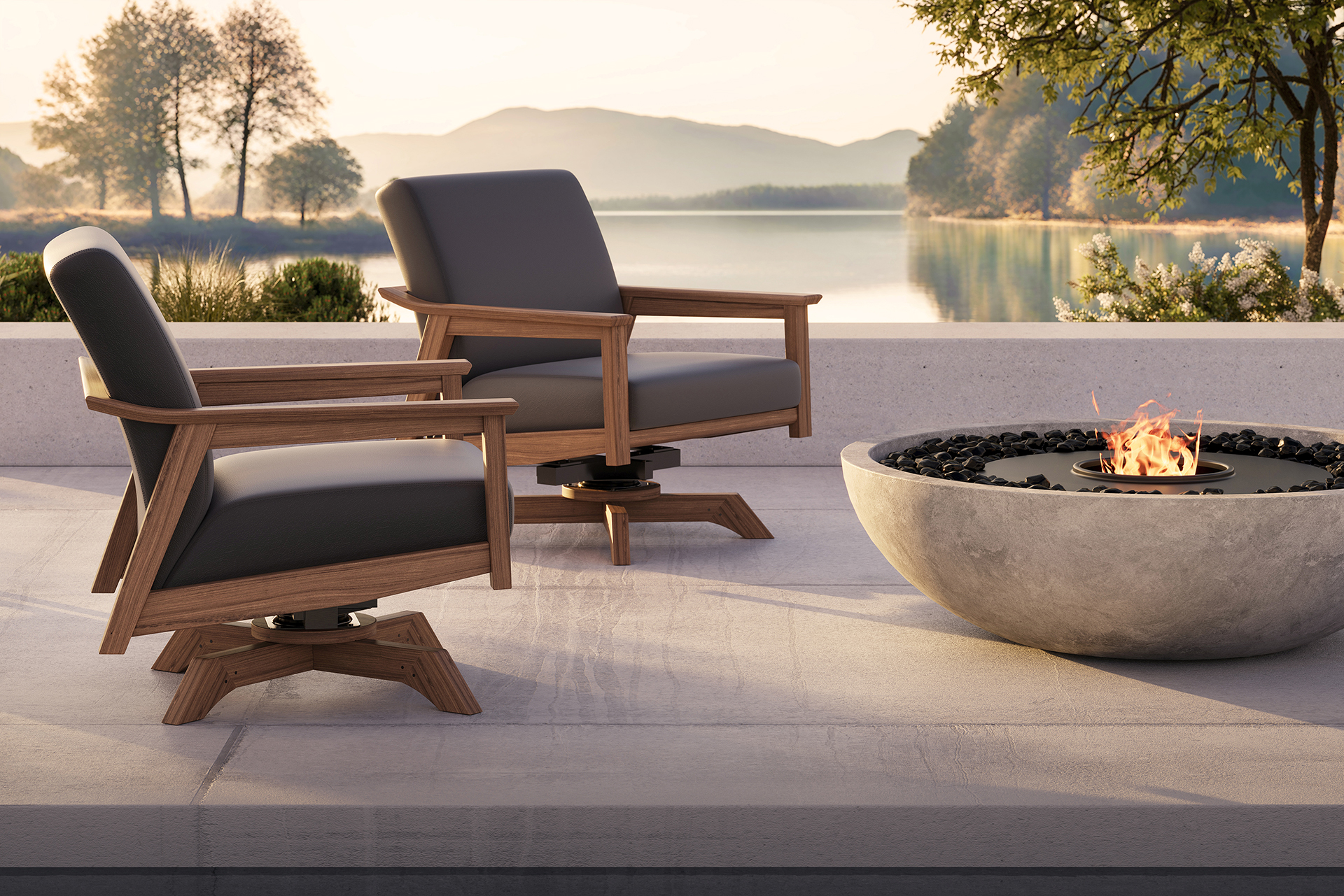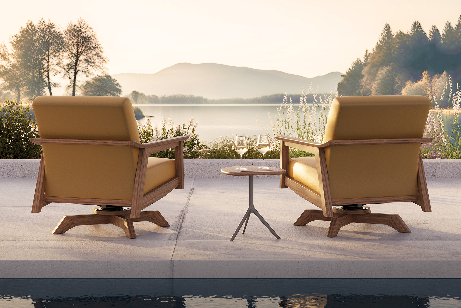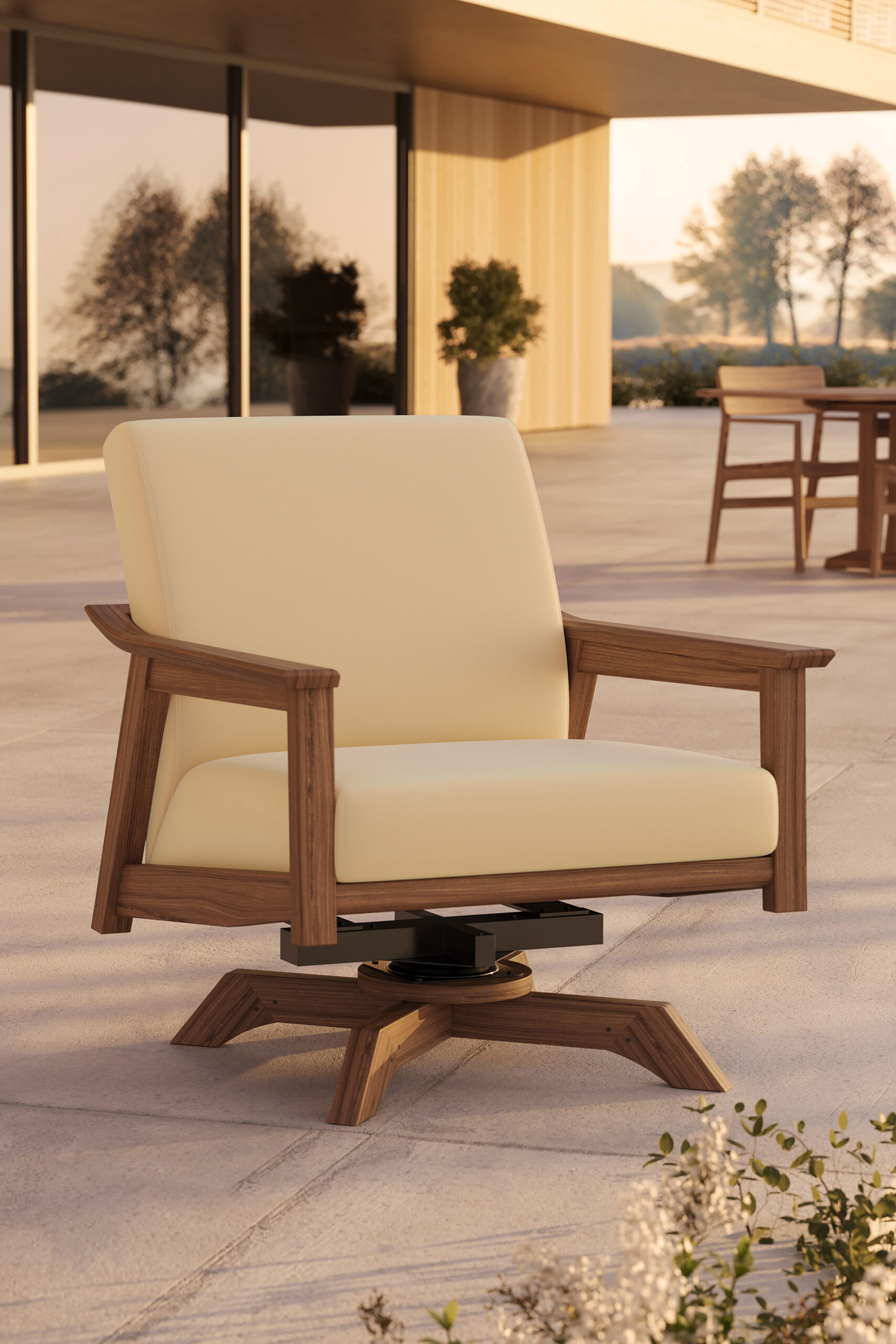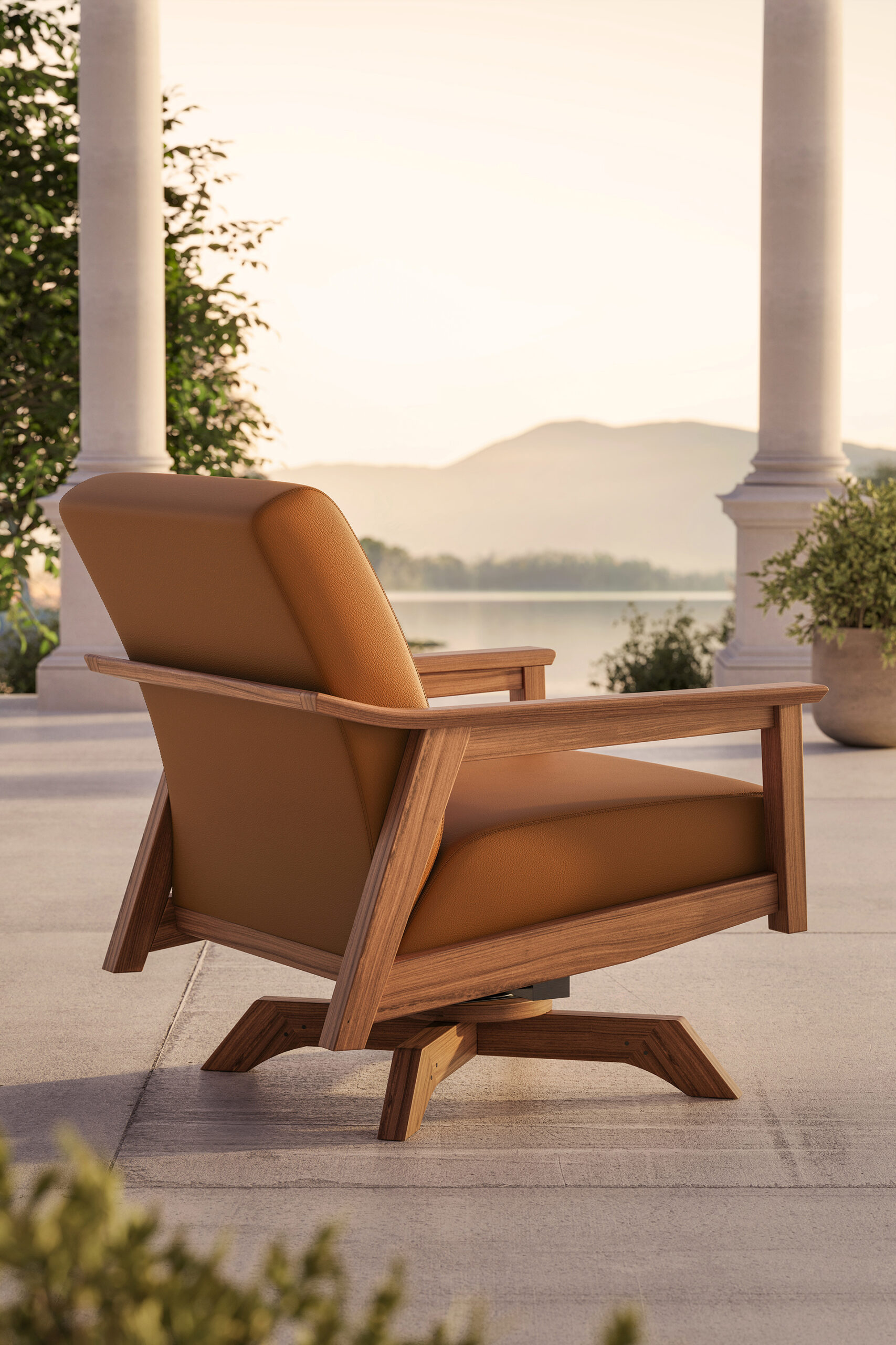 - Swivel rocker is configured from an inspired interplay of an Ipe timber frame with a powder-coated aluminum base insert under premium, multi-layered cushions in a selection of Ultraleather® animal-free leather.